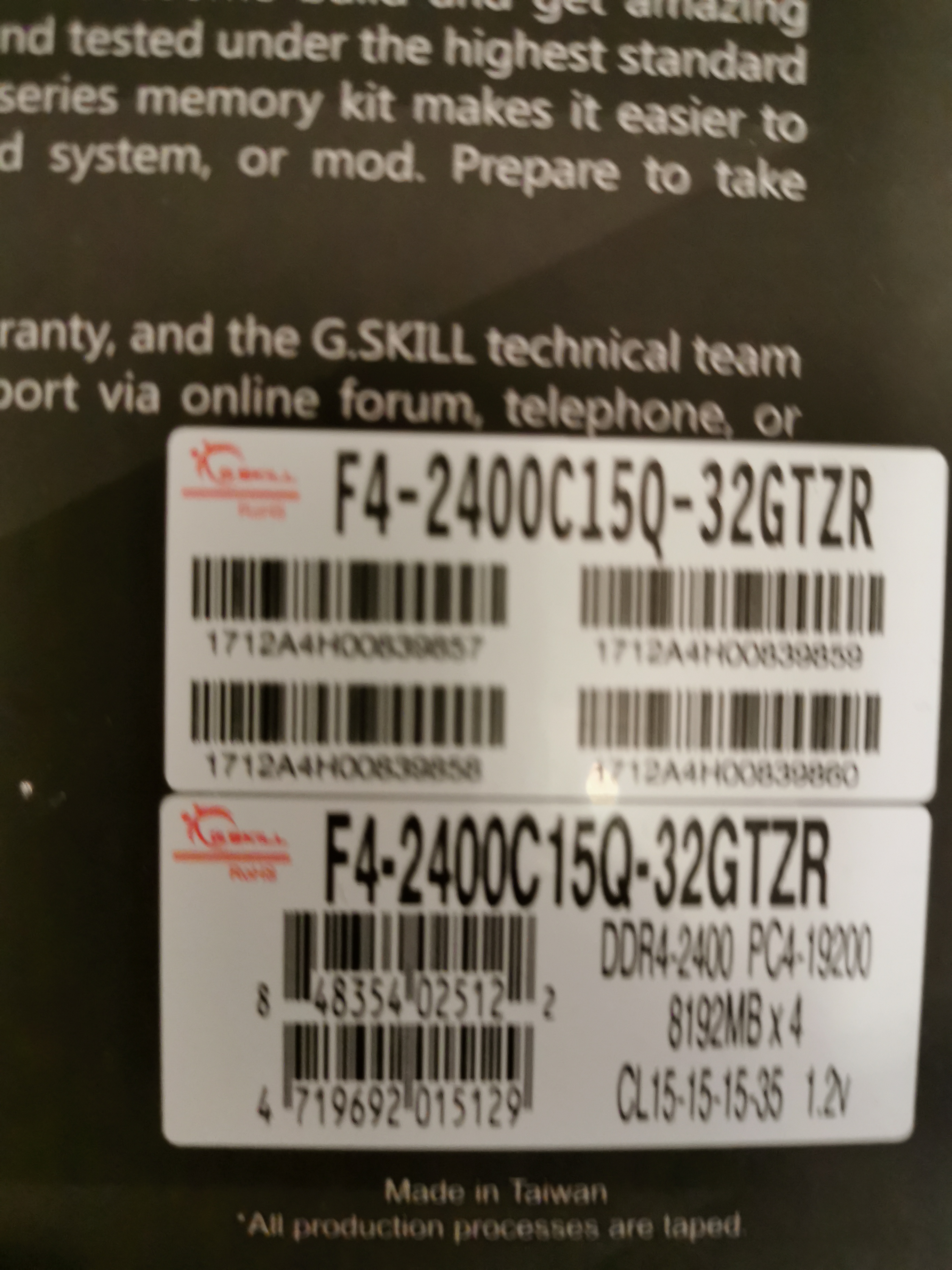 OK danke für die Info. Wenn ich zuhause bin schick ich mal ein FotoNameHere schrieb:G.Skill DIMM 32 GB DDR4-2400 Quad-Kit, Arbeitsspeicher > Hat eine genaue Bezeichnung. Poste bitte ein Foto von dem Aufkleber.