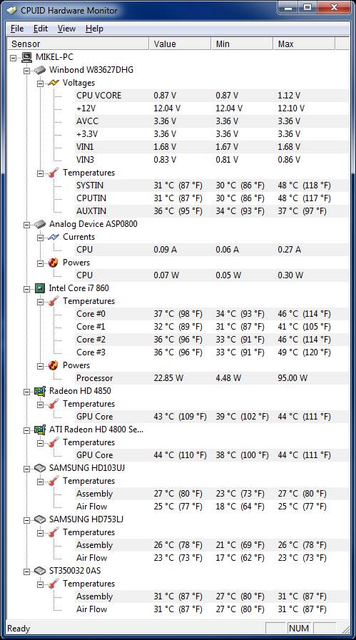 temps habe ich mit asus probe 2 und asus al suite ausgelesen