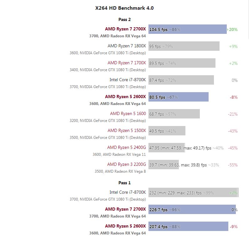 Handbrake bzw. x264/x265 zeigt ziemlich gut, was die beiden CPUs theoretisch unterscheidet. Da liegt der 2700x nur ein paar Prozent vorn, obwohl 2 Kerne mehr hat. Dieses Ergebnis ist quasi das Maximum, was man bei bester Optimierung auf beide Architekturen erreichen kann. Aufgrund der Komplexität von Spielen, wird man sich dahin aber nur annähern.