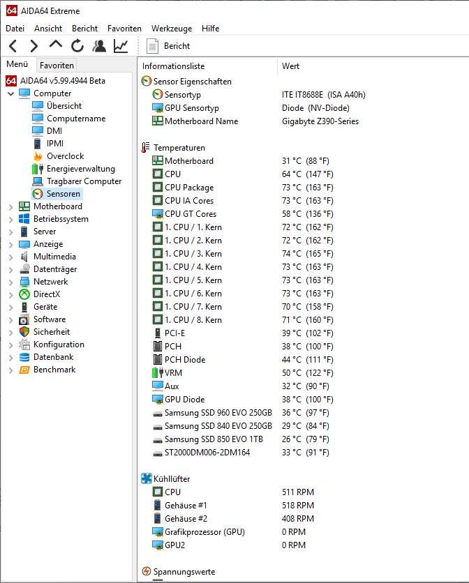 Eigentlich sollte der Lüfter ab 70 Grad und da bin ich drüber dann mit full laufen, tut er aber noch nicht.