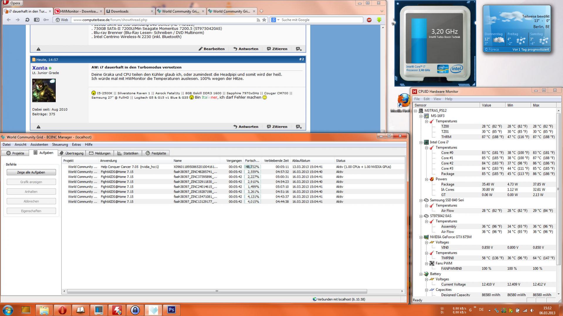 Also es kann nicht daran liegen, dass mein System zu heiß wird, weil wenn ich die Software von WorldCommunityGrid.com laufen lasse (diese stellt deine Rechenleistung für wissenschaftliche Zwecke wie z.B. die Krebsforschung zur Verfügung), dann wird der Lüfter zwar sehr laut, aber er bleibt konstant auf 3,2 GHz...
