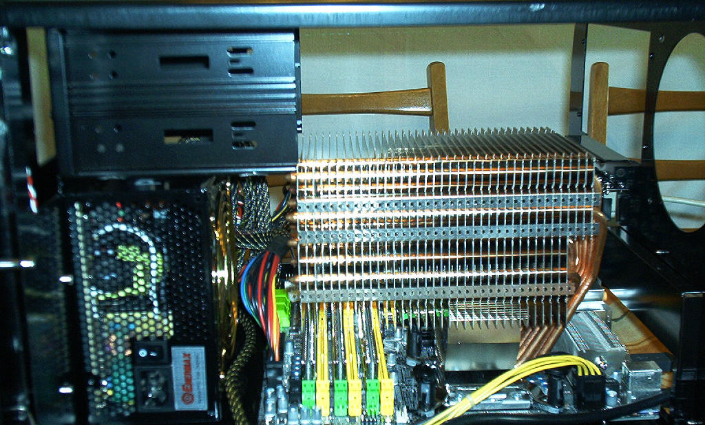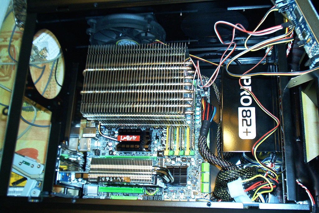 System Xeon W3520 gekühlt mit einem Orochi Kühler von Scythe. OCZ 6GB 1600 7CL Ram und aktuell ner ATI 4670 Ultimate (passiv). Läuft mit nem Enermax 425 Watt PRO82+ Netzteil.