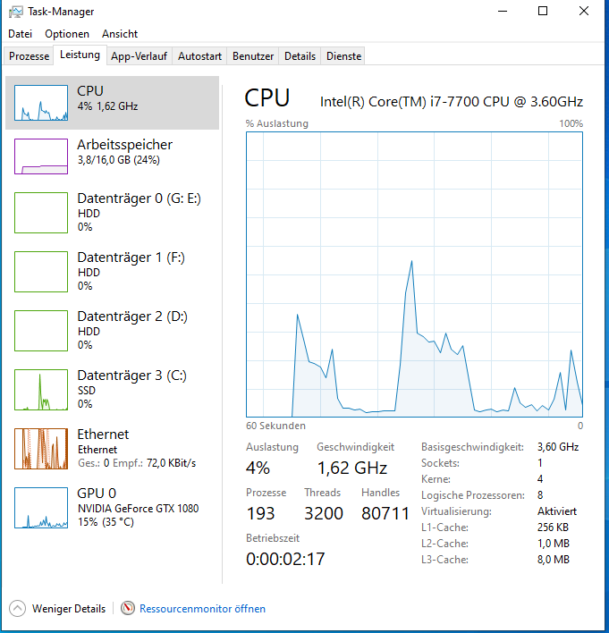 Klick mal bitte beim Task Manager bei CPU auf das Auslastungfeld und wähle "Graphen ändern" aus und auf "Logische Prozessoren" gehen. Damit kannst du die Gesamtauslastung der einzelnen Kerne/Threads sehen.