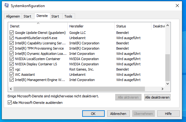 Ich habe sie ja nur ausgeblendet aber nicht deaktiviert oder soll ich etwa auf "alle deaktivieren" klicken und dann zusätzlich das kässtchen "ausblenden"wuselsurfer schrieb:Ich meinte die Dienste in msconfig.