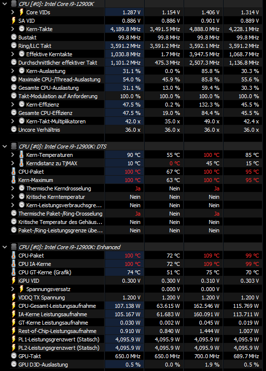 Ich habe schon die WLP gewechselt. Die WaKü "gecheckt" ob sie pumpt. Einstellungen im BIOS vorgenommen. Einige meinten im Forum sowohl auf anderen Seiten/Youtube das man die long/short power limit nicht auf auto setzen soll, sondern long-150 und short-180. Ich habe mich auch mal im bios umgeguckt und da gab es den Turbo-Modus. Wenn ich den ausschalte sind zwar die Temperaturen im schnitt 70°C aber die Leistung schwindet dahin.