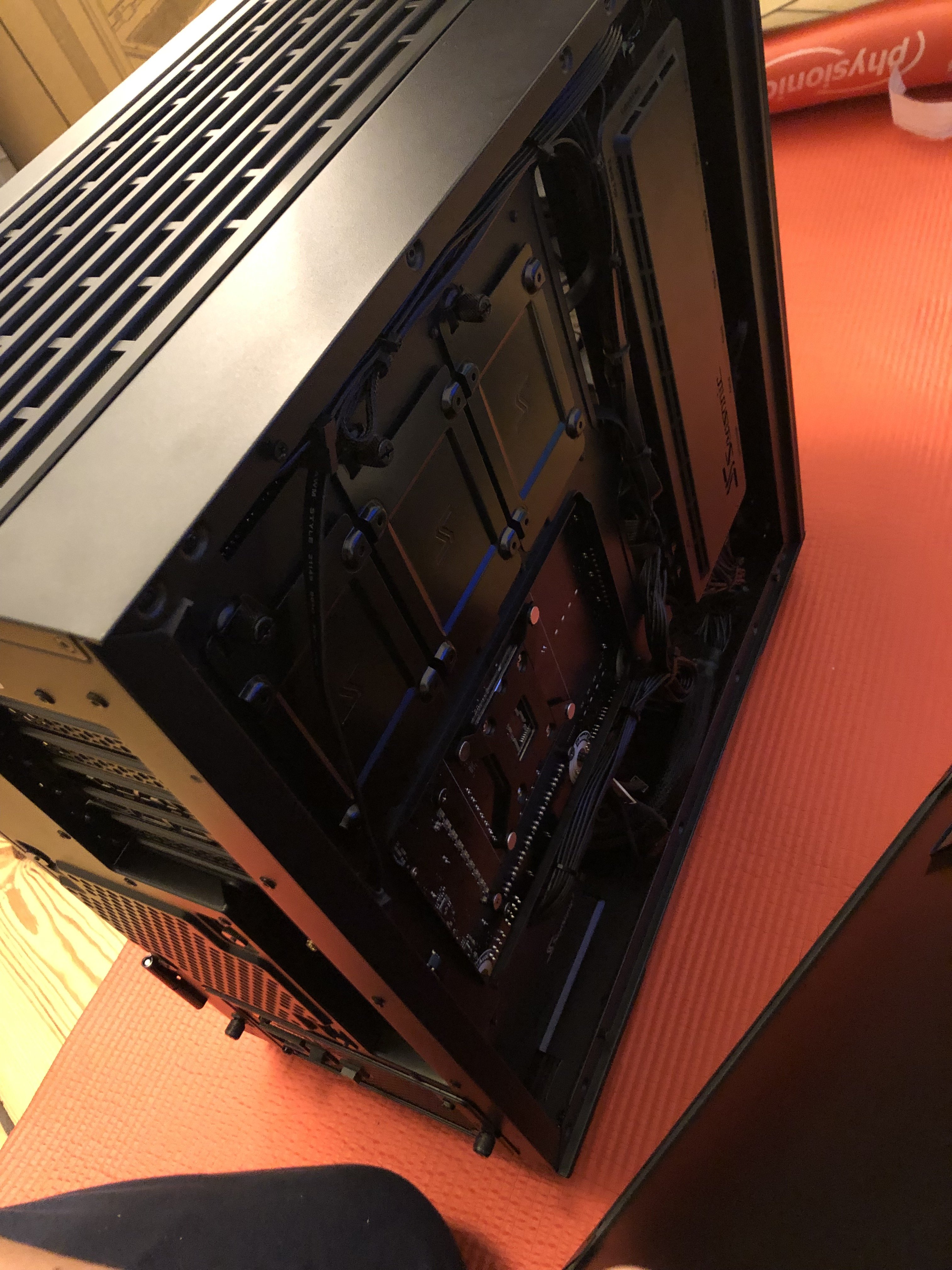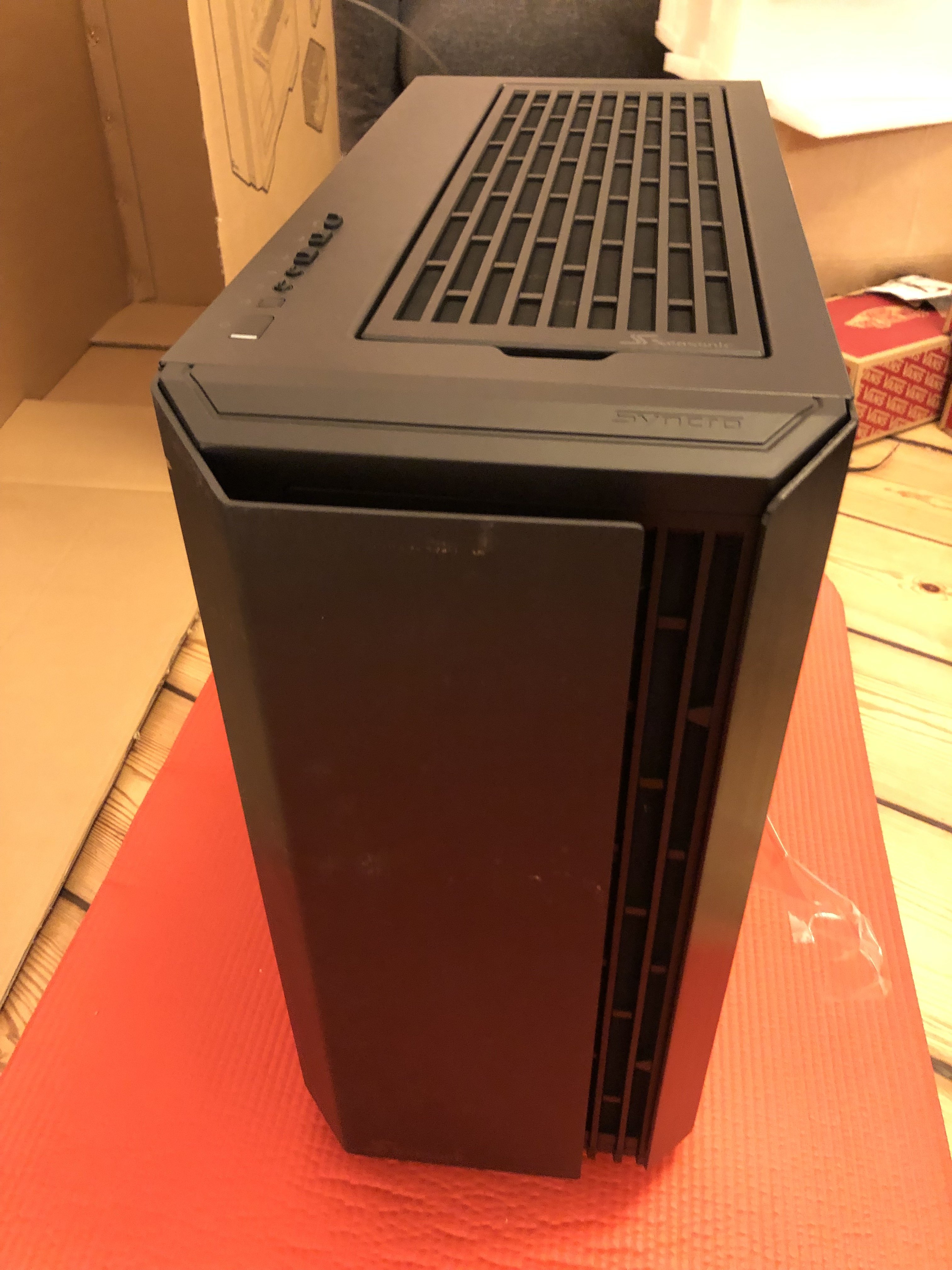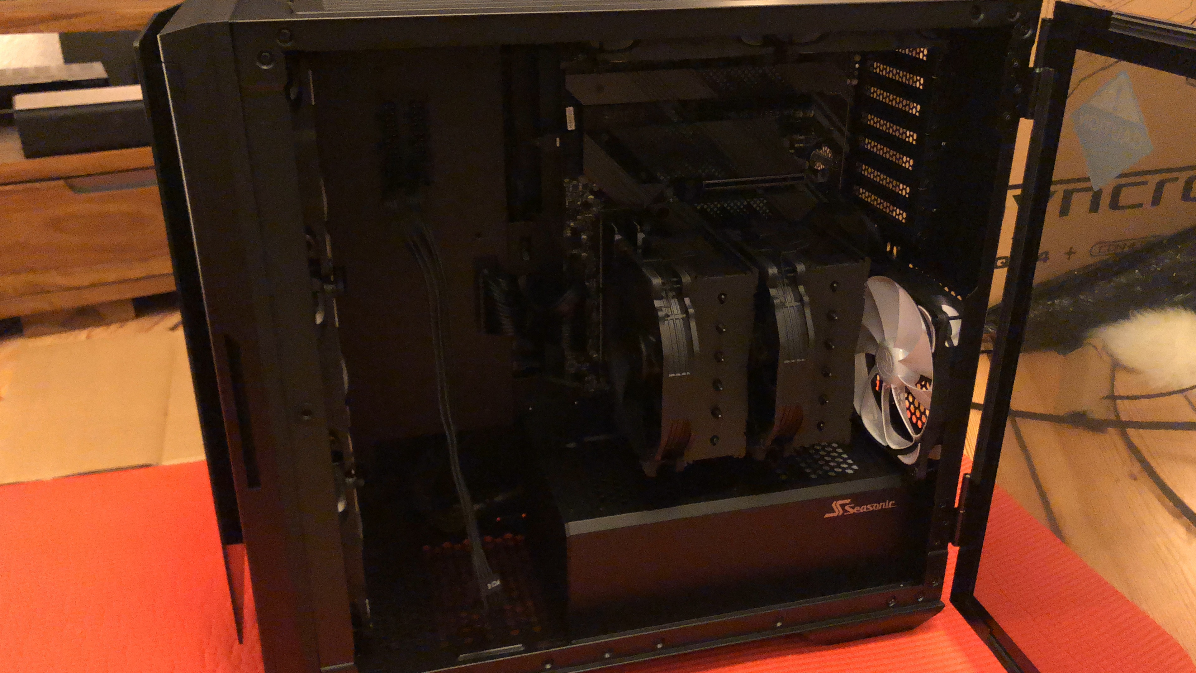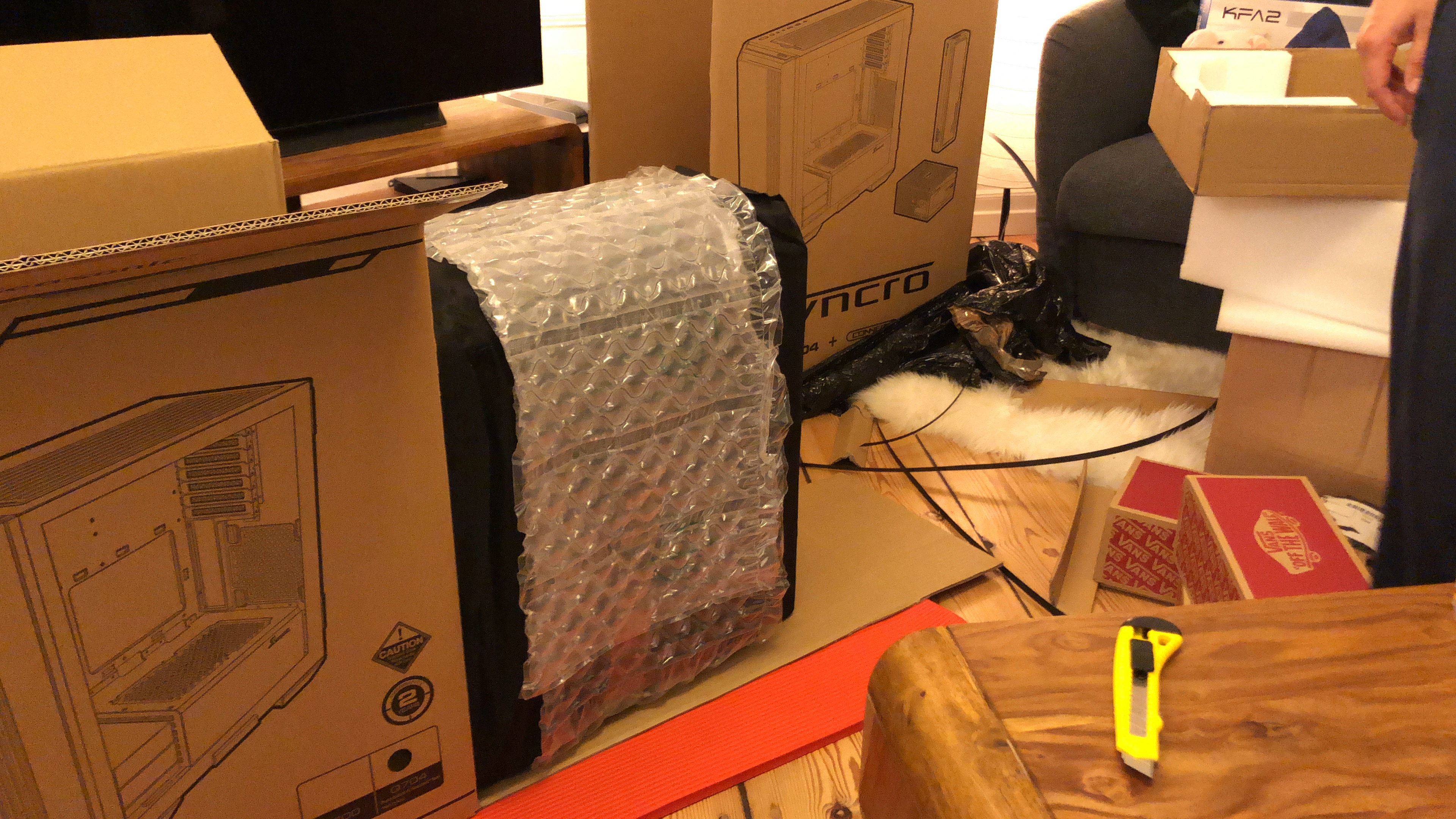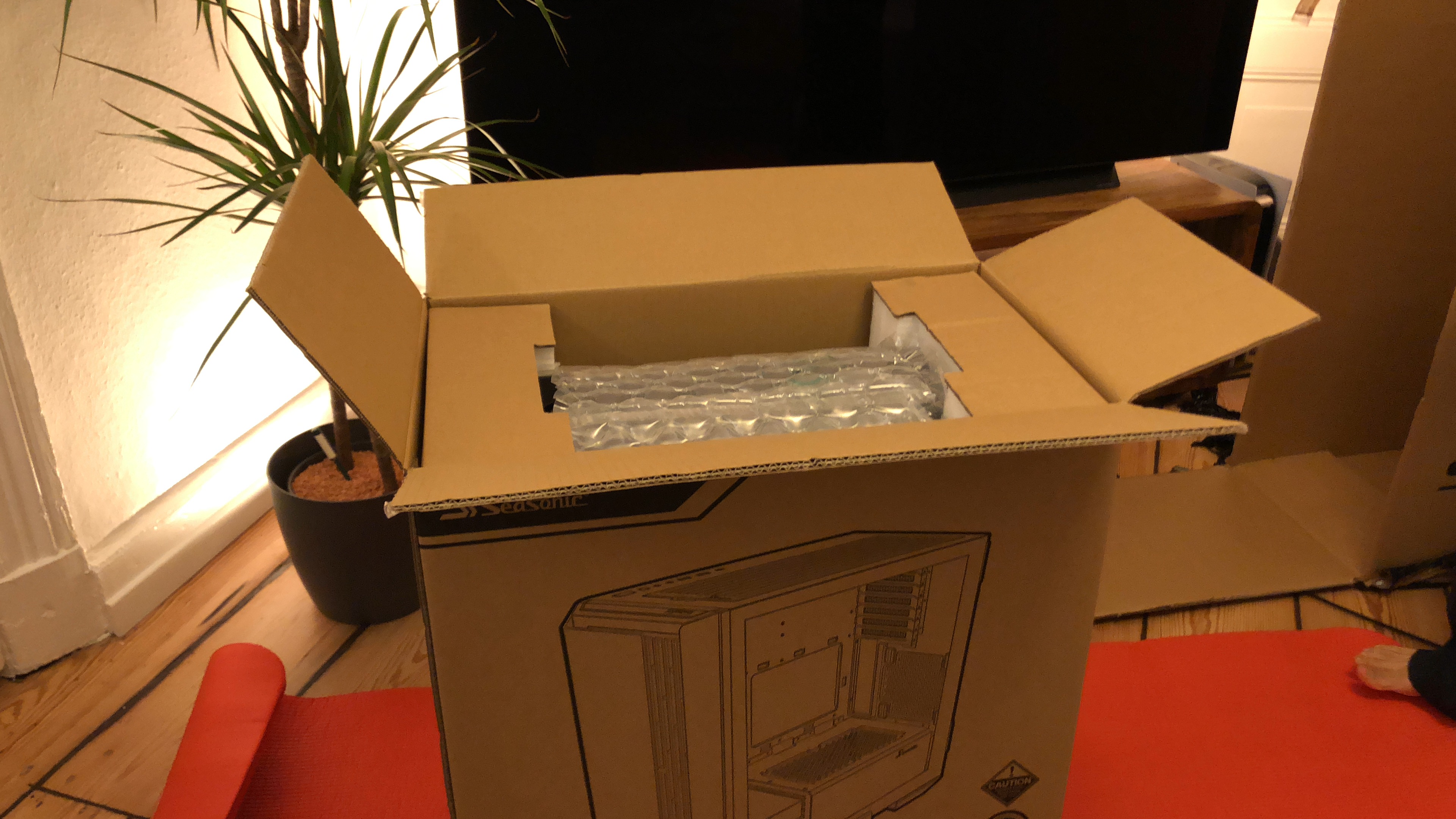 Paket jetzt ausgepackt...mamma mia, soviel Verpackungsmaterial...aber ich muss zugeben, wirkt professionell und auch der PC...die Verkabelung wirkt echt aufgeräumt! Nun muss er nur noch laufen, aber 30 Minuten Ruhezeit wird vor der Erstinbetriebnahme empfohlen/befohlen, also warte ich. Hab mich gerad gefragt, ob ich nicht jetzt schon die Grafikkarte einbauen sollte, aber wahrscheinlich erstmal System testen, dann Windows, dann Karte, ist besser so-oder? Es folgen ein paar Pics...falls das Forum meint, zu viel oder zu uninteressant, dann sorry und einfach löschen.