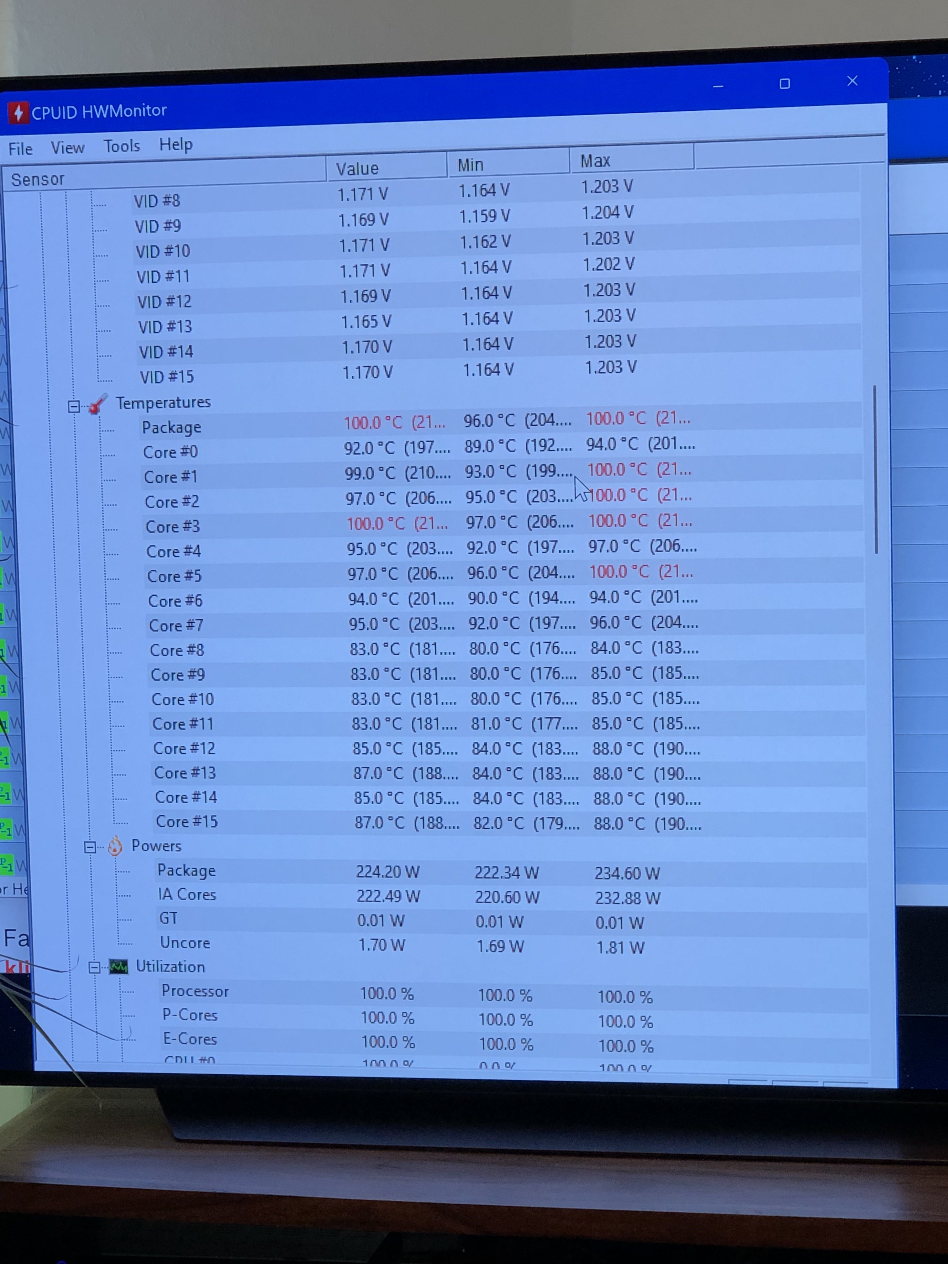 Da CPU vorhin nur ein paar %ausgelastet war, kommt jetzt im Umkehrschluss die Maximaltemperatur zum Vorschein....100Grad...jetzt schon auf knapp 50% der Kerne...