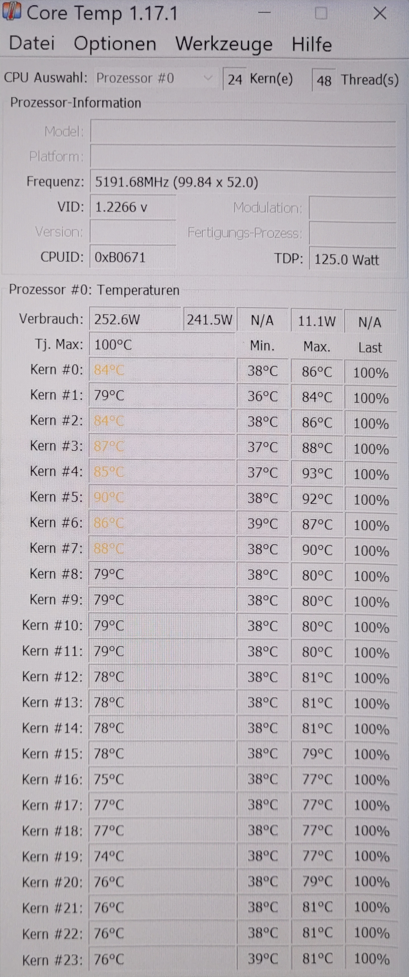 Hier ist aber auch zu bedenken, dass ich nur 257 Watt max. anliegen hatte. Denn in anderen Tests mit 278 Watt bin ich auch auf etwa 95 °C auf einzelne Kerne gekommen und in einem Test hatte ich sogar 307 Watt anliegen und erreichte auch mit einzelnen Kernen bereits 100 °C. Selbst mit meiner Wasserkühlung bekomme ich ab 300 Watt fast nicht mehr gekühlt.