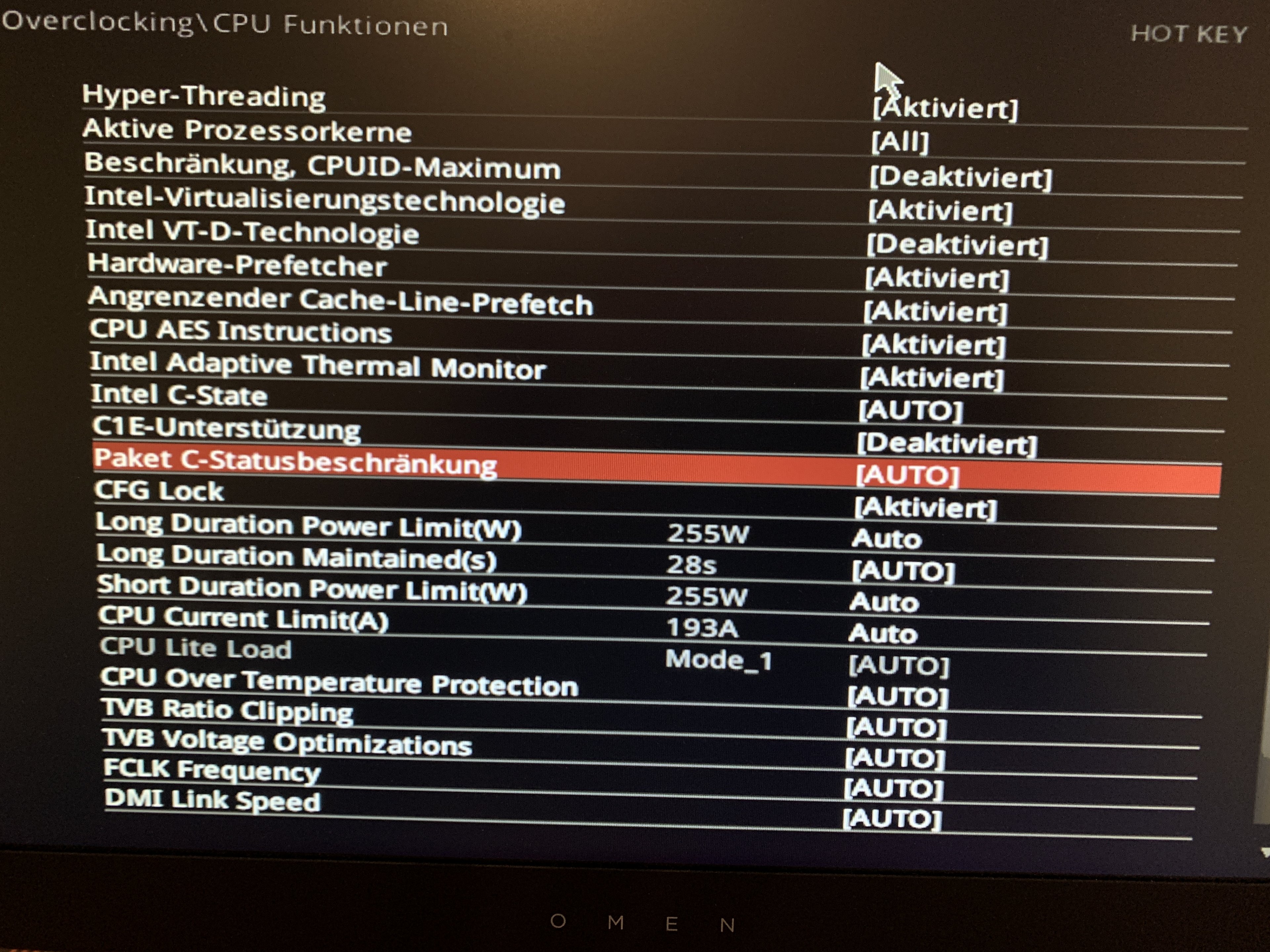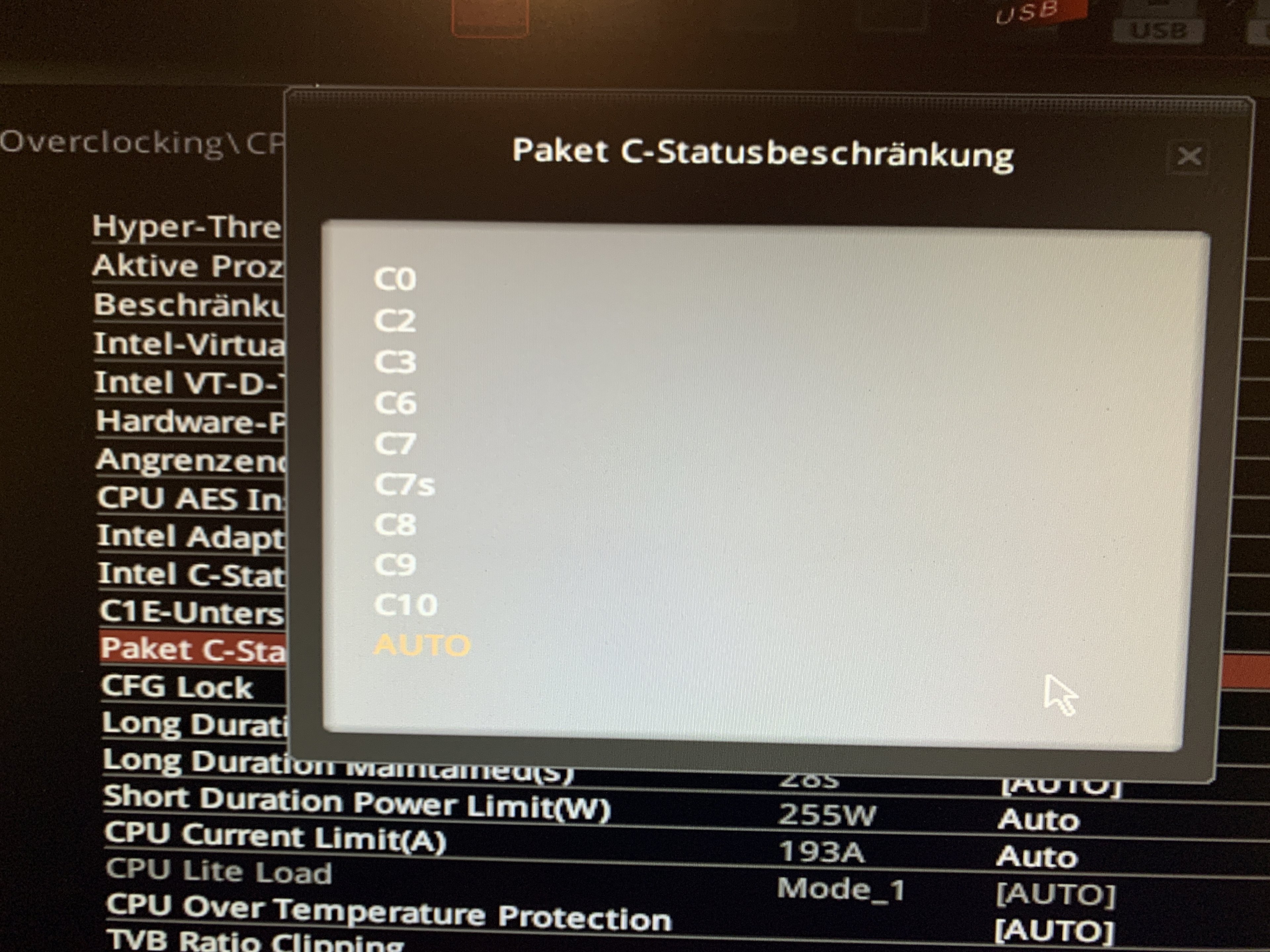 Er empfahl mir auch die Paket C-Statusbeschränkung auf die höchste Einstellung (bei mir C10) zu setzen, damit irgendwas im Ide besser geht. Ich glaube, die VCore geht wohl im Ide dann niedriger, wenn mein NT das mitmachen sollte.. Hab da jetzt nichts angerührt...