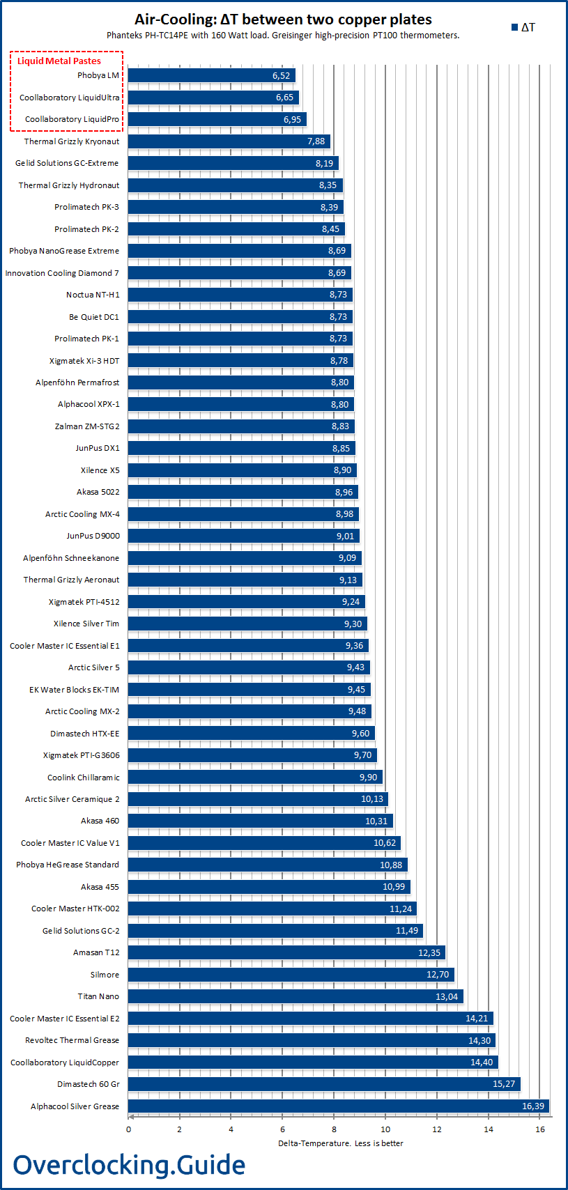 Kryonaut ist kein Flüsigmetall, das wäre Conductonaut von Thermal-Grizzly, die hat auch eine noch mal bedeutend höhere Wärmeleitfähigkeit (73 W/mk) und wurde leider nicht mitgetestet.