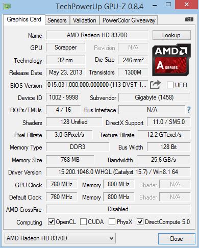 Grafik: AMD Radeon™ HD 8370D Grafik on APU (760 MHz, 128 Shader) / PCI-Express Steckplatz frei