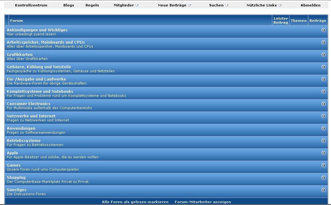 Ich hätte einen Vorschlag zu machen. Und zwar auf der Forum Startseite. Ein Buton, der mit einem Klick das Forum so aussehen lässt. Weil es mittlerweile so viele Kategorien gibt, bin ich langsam überfordert, das ganzen Forum runter zu scrolen. Danke.