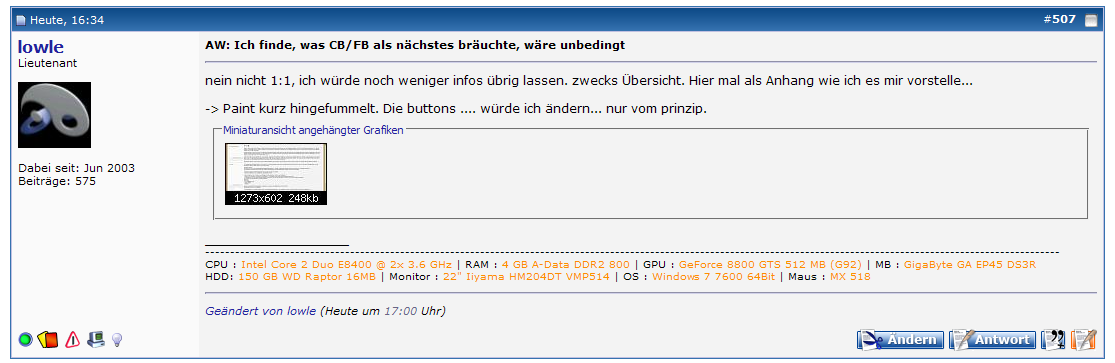 Bei der Reduktion der Farben ging es mir vor Allem darum, dass die Forumsfunktionen (Buttons) nicht so betont werden. Diese Sind imho nur nötig, wenn man wirklich etwas schreiben will, und könnten ansonsten vollkommen ausgeblendet werden.