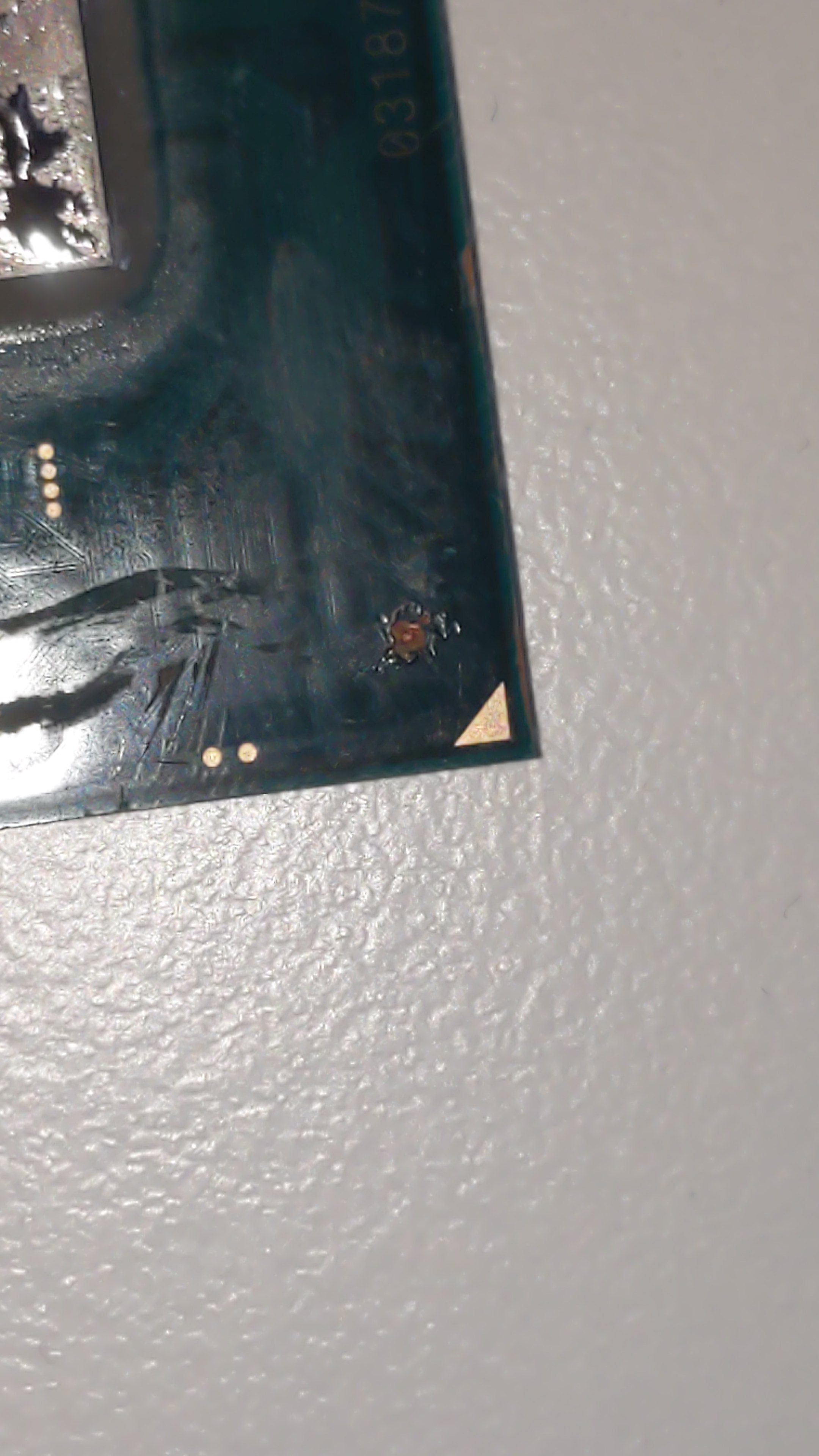 Beim Versuch meinen Prozessor zu köpfen habe ich leider die Leiterplatte beschädigt. Wie man auf dem Bild sehen kann ist dort jetzt ein kleines, kupferfarbenes Loch. Ich habe zwar nicht viel Hoffnung aber bevor ich den Prozessor in den Müll werfe frage ich lieber noch mal ob man da was machen kann. Vlt kann man das irgendwie isolieren oder so? Platte austauschen? Ich bekomme übrigens keinen Fehlercode da ich noch nicht mal ins bios komme.