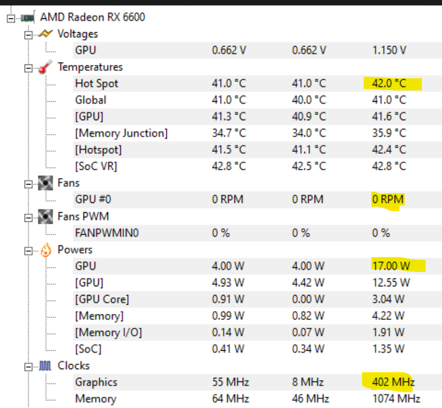 Hab zwar keine 6600 aber bei den AMD Karten die ich habe / hatte sind ~700mv in den unteren Powerstates durchaus normal.zazie schrieb:Läuft eine RX6600 tatsächlich mit so niedriger Spannung? Siehe zweiten Screenshot, erste Zeile.