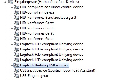Mein Bild zeigt meine Einträge im Gerätemanager zu einem Logitech MK710 Maus/Tastatur-Set, das ebenfalls mit Unifying arbeitet.