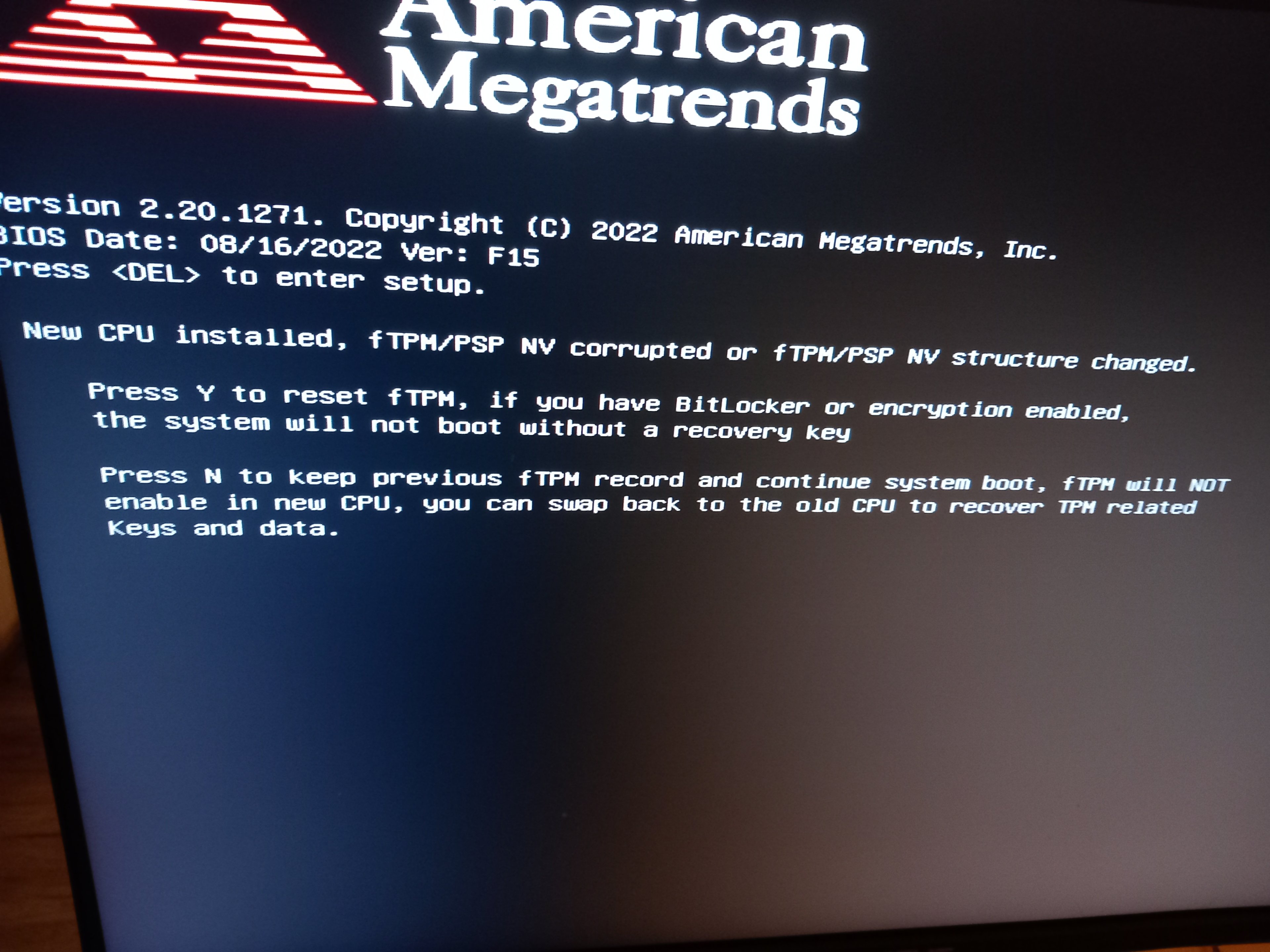 2. Beschreibe dein Problem. Je genauer und besser du dein Problem beschreibst, desto besser kann dir geholfen werden (zusätzliche Bilder könnten z. B. hilfreich sein):Hallo Leute ich habe heute die cpu gewechselt von einem R 9 3900x auf einen R 7 5800 x 3d . Außerdem habe ich eine Corsair aoi eingebaut eigentlich läuft alles. Ich komme aber nicht ins BIOS um das Tpm anzustellen. Außerdem möchte ich ja gerne das Xmp Profil laden. Wenn ich den Pc anschalte steht dort ein Text das ich die Cpu gewechselt habe und das tpm ausgeschaltet ist. Ich muss dann auf N drücken um den PC zu booten. Ich habe wirklich keine Ahnung was ich jetzt machen soll