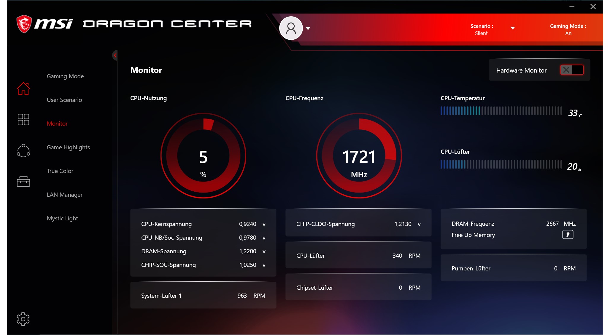 Wie zu sehen ist ist die Prozessortemperatur im Silentmode wenn die Lüfter am wenigsten arbeiten am niedrigsten. und im Custom Mode wenn alles voll aufgedreht ist am höchsten. (Ähnlich wie im Extreme Perfomance Mode). Die Temperaturen reagieren beim umstellen der Modes sofort.