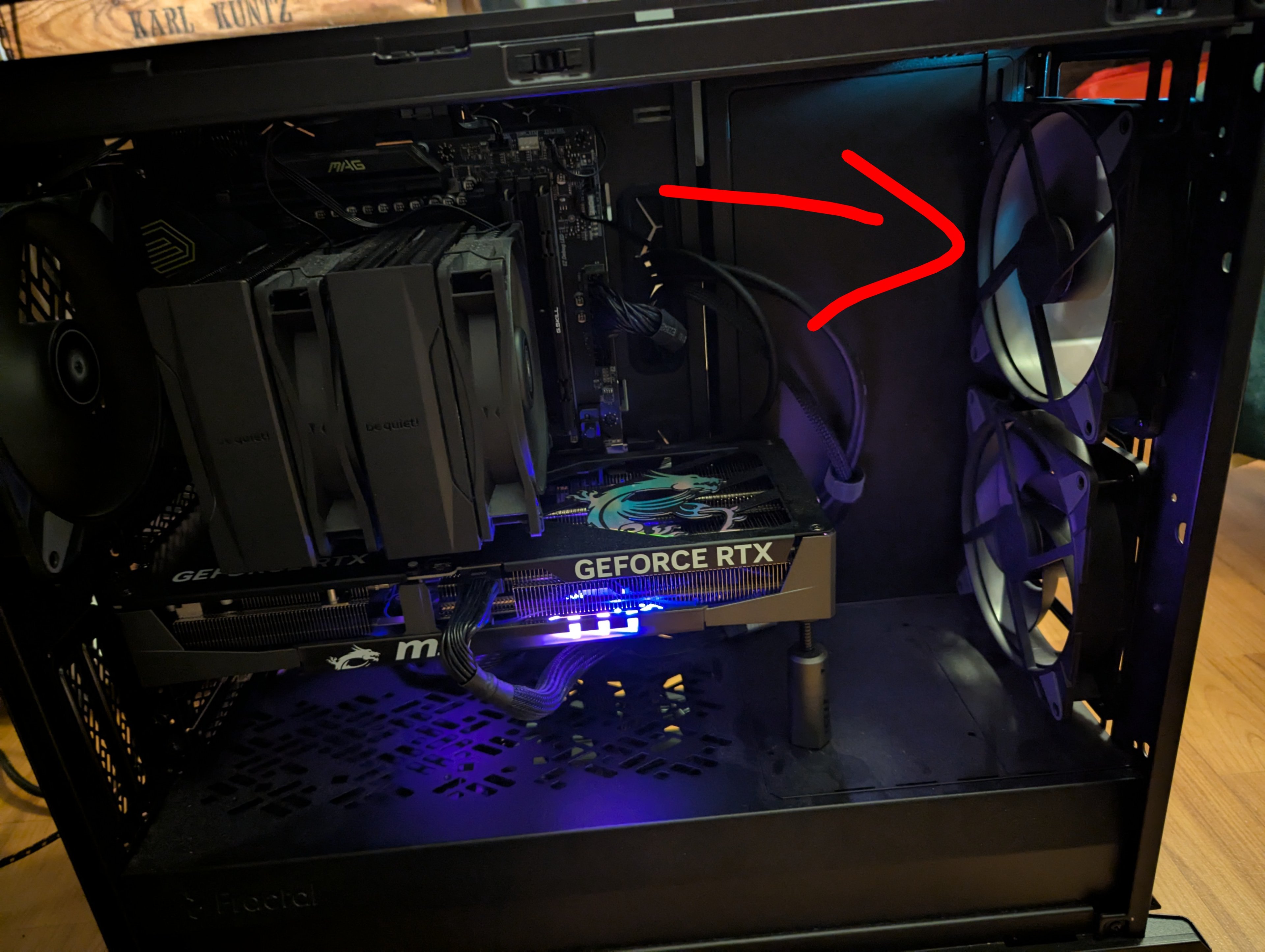 Also wieder zurück untern Schreibtisch und einzeln durchgetestet. Es war wieder der Lüfter vorne, oben, der (nachdem man ihn abstöpselte) das Geräusch verschwinden ließ. Aber der war ja bereits getauscht. Also dieses Mal den von vorne unten nach oben gepackt (von dem wusste ich vom Einzeltest, dass er auf jeden Fall geräuschlos war) und nun generiert dieser das Geräusch.