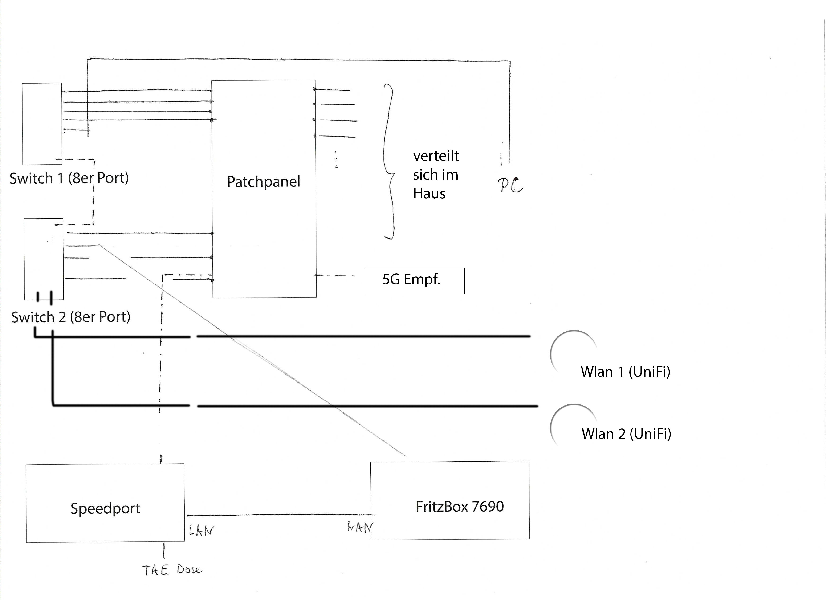 Das 5G Modul hängt am WAN Port vom Speedport. Wie ich mitbekommen habe, soll das dort auch bleiben. Wenn ich aber die Daten vom Speedport als Modem an die Fritzbox weiterleiten soll, soll auch dieses Netzwerkkabel an den WAN Port.