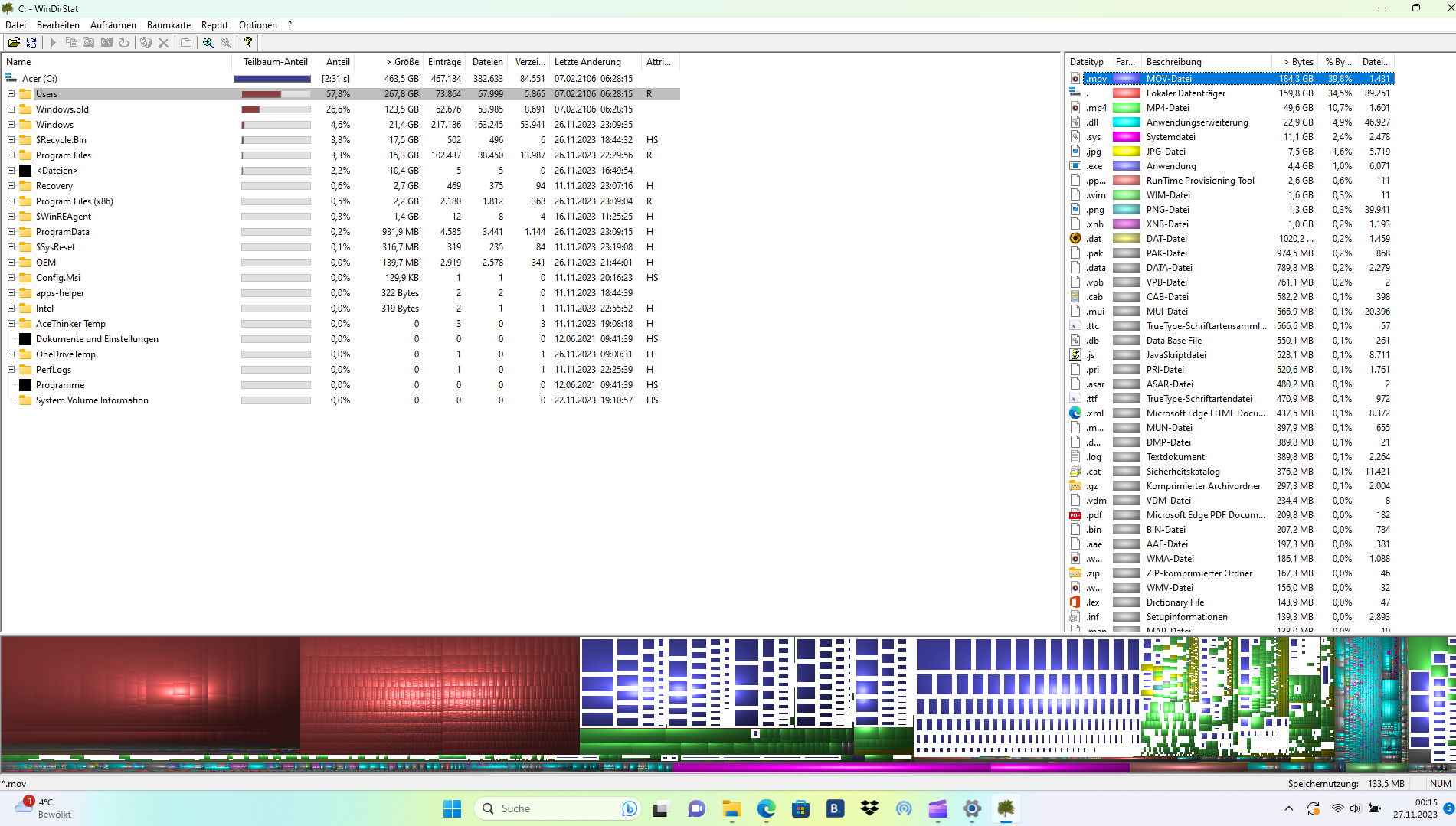 das du extremviele Videos auf dem PC hast (ca 50% des belegten Platzes), aber eine sehr kleine Festplatte, die zu 25% mit einer alten, nicht mehr gebrauchten Windows Installation belegt ist
