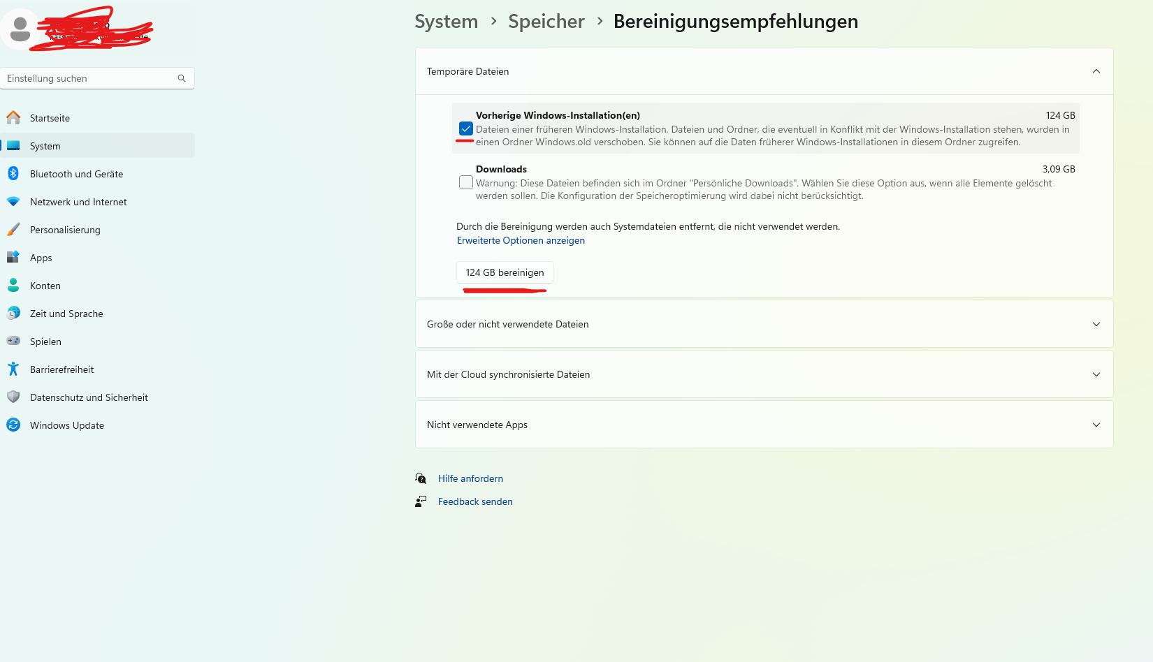 3. Nach dem man auf "Bereinigungsempfehlungen" klickt, ist da oben bei "Vorherige Windows-Installationen" ein Haken drin. Weiter unten steht was von "124 GB bereinigen"