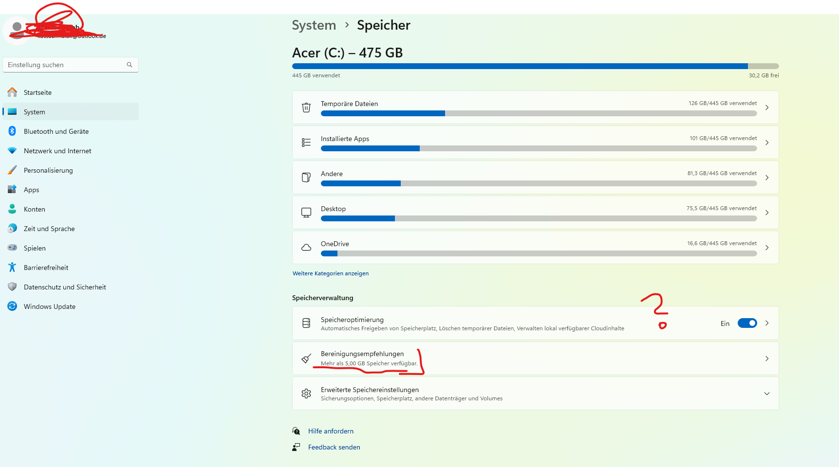 2. Dann hier auf "Bereinigungsempfehlungen" (ist das richtig oder muss ich auf "Speicheroptimierung"?)