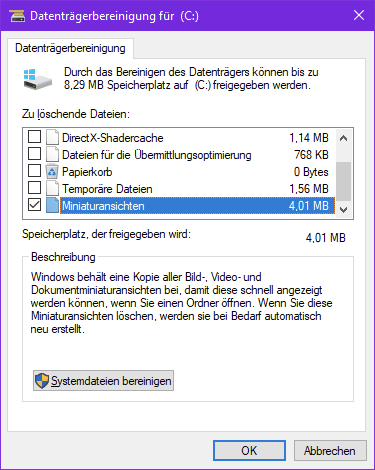 Aber einfacher geht es über die Datenträgerbereinigung wie im Beitrag #20 beschrieben, da können die Miniaturansichten auch gelöscht werden - hatte nicht mehr daran gedacht, dass diese im Dialog enthalten sind.