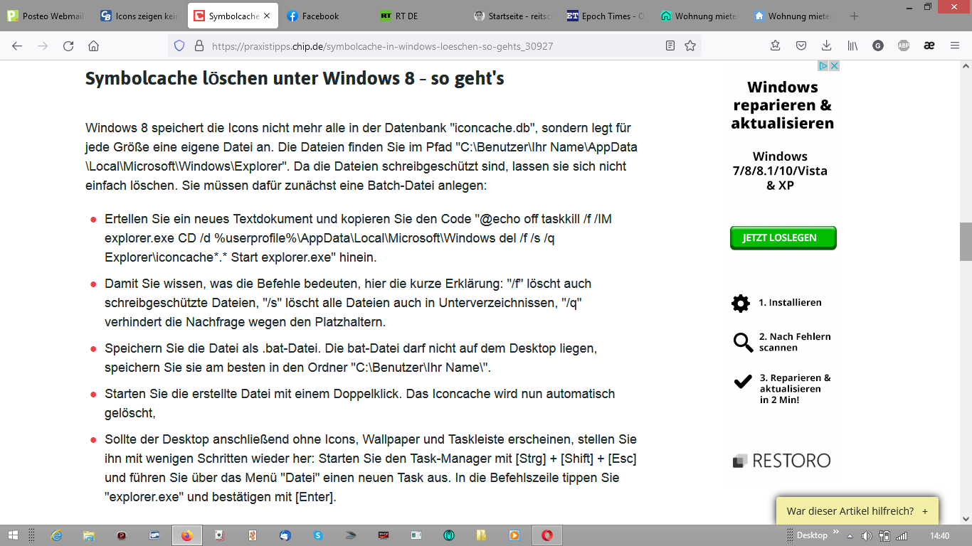 Im Beitrag 10 steht eine Anleitung, die ich nicht ausführen kann. Ich wollte das noch ausprobieren. Wenn ich "Datei" öffne, gibt es aber "Ordner- u. Suchoptionen" nicht.