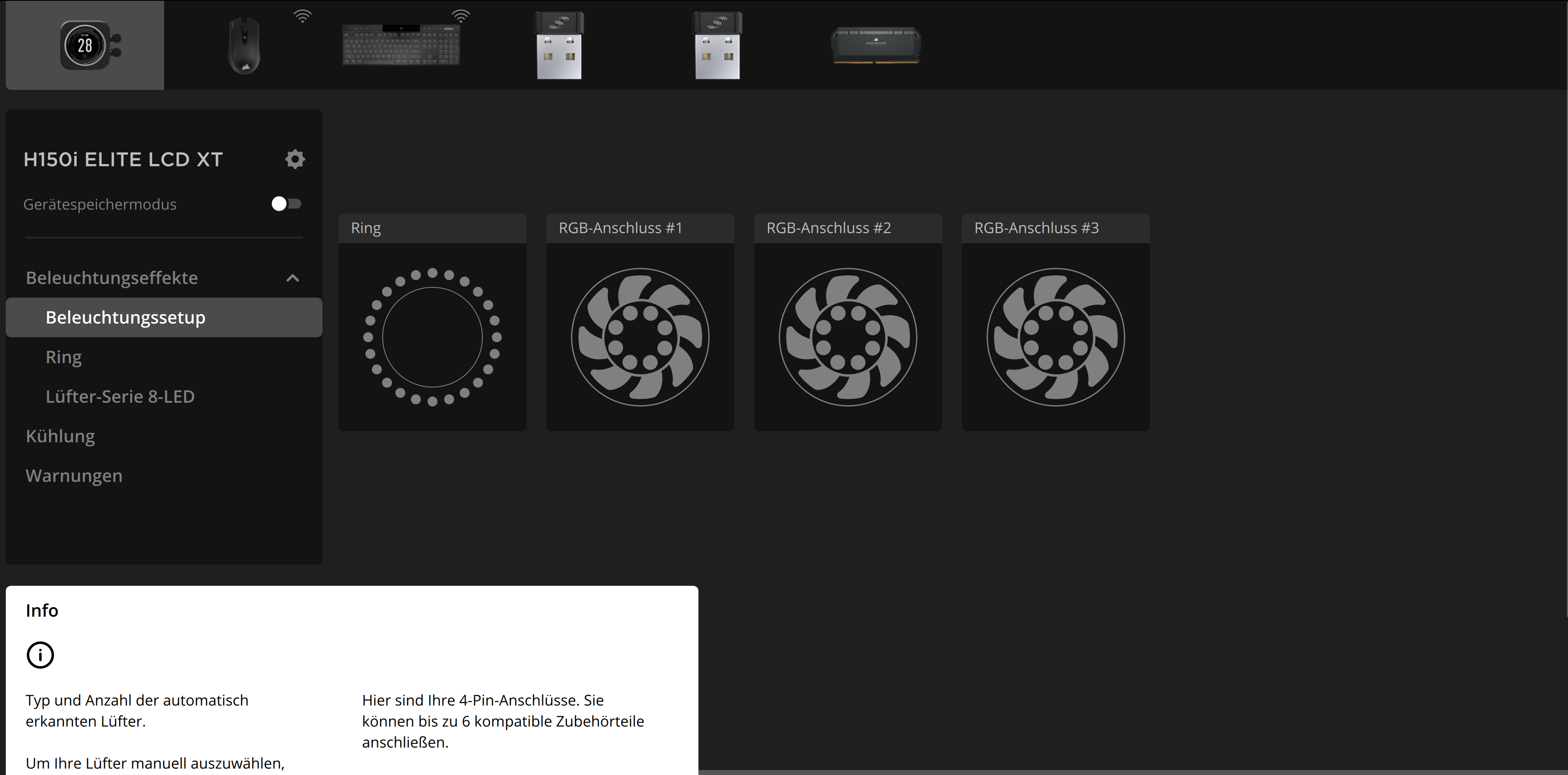 Hallo, ich habe mir die Wasserkühlung gekauft und es funktioniert auch ohne Probleme, aber man kann bei mir komischerweise nichts in iCUE einstellen, ich habe das selbst gar nicht gewusst das man den kleinen Bildschirm einstellen kann, bis ich es mal auf Youtube gesehen habe, und jetzt frage ich mich schon was bei mir falsch läuft, ich hänge unten einige Bilder an, dann seht ihr was ich meine.