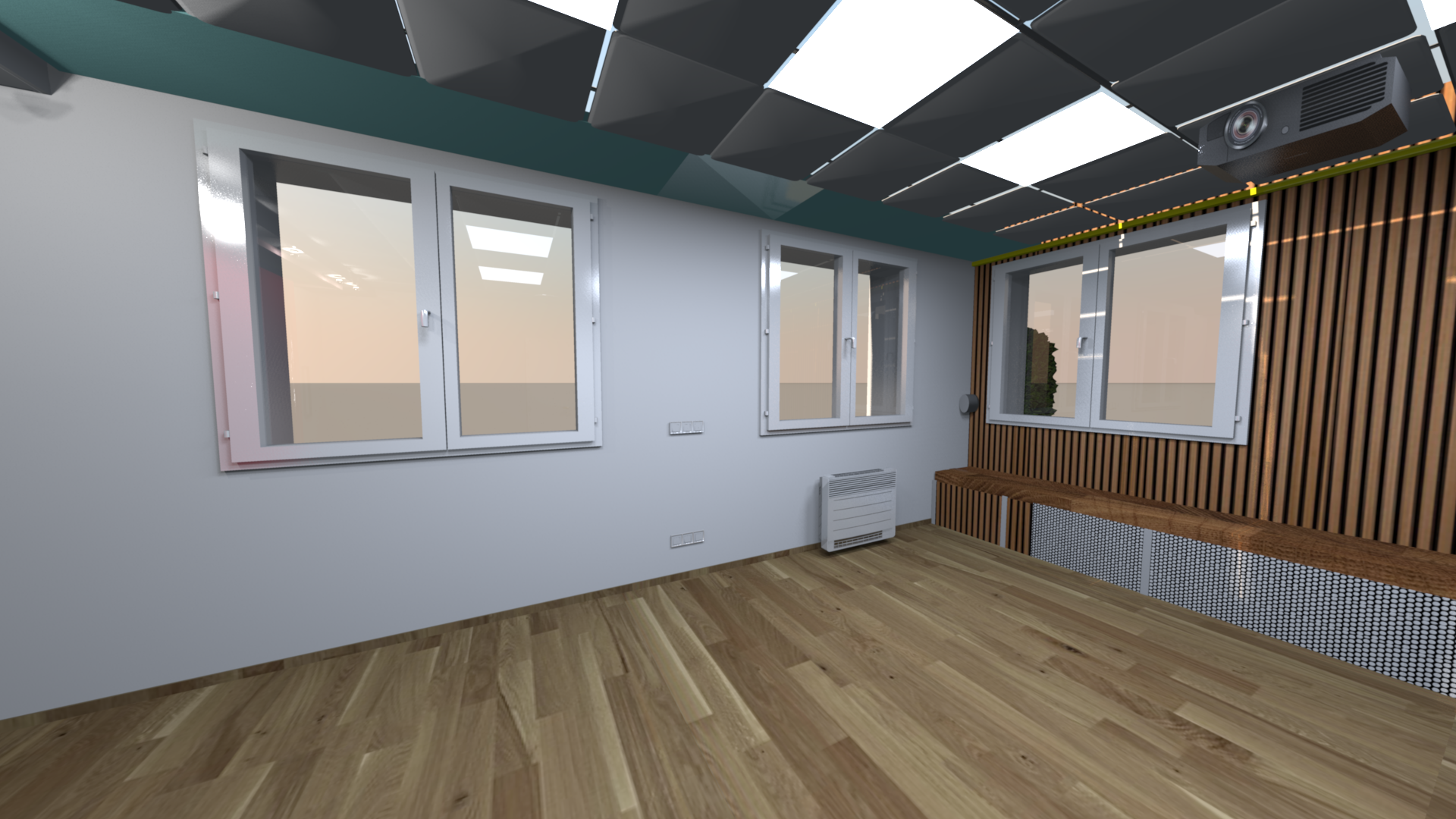 - In die Rasterdecke kommen 6 LED Paneele (hue kompatibel) und die restlichen Elemente werden akustisch transparent, da dahinter Sonorock kommt zur breitbandigen Absorption