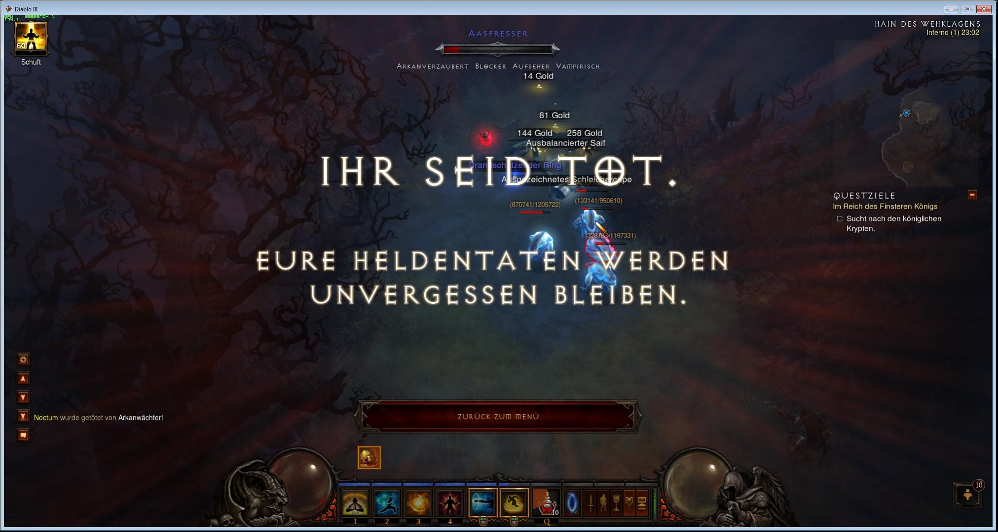 eigentlich wollte ich noch gemütlich mp1 farmen und dann kamen diese biester und ich war eingemauert und 3 arkanlaser zerschnibbelten mich. trotz nahtoterfahrung und oh-shit-button + trank, sank das leben unaufhörlich
