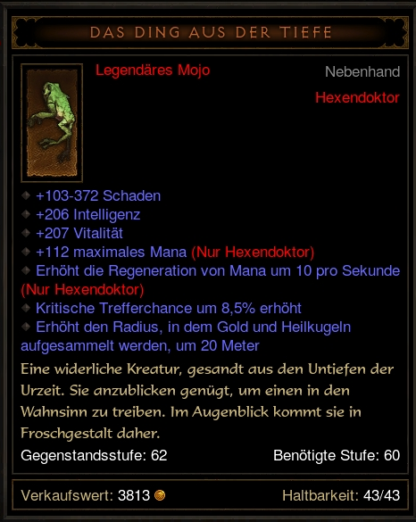 unter 150m würde ich das nicht ins AH stellen, magst du mir das nachher mal linken?Jirko schrieb:Also Legs droppen bei mir heute wirklich wie bekloppt. Auf HC hab ich das schicke Mojo gefunden. Mal gucken, was das wert ist - dcdead ist ja leider im Urlaub. :/