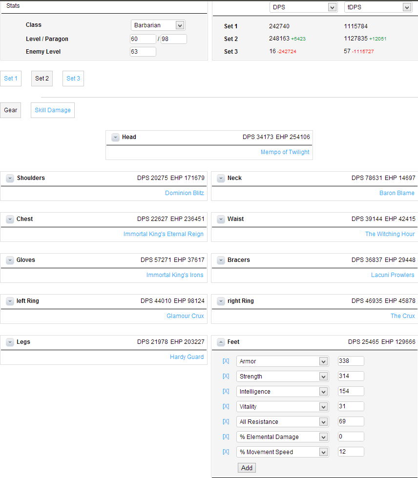 Set 1 ist dein momentanes Gear. Set 2 sind die Eiskletterer, wo ich nur den Elementar Schaden rausgenommen habe, und die Stärke angepasst habe.