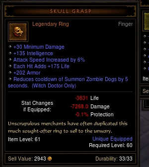 Der WD ist halt momentan etwas abhängig von den LoH-affinen Skills, weshalb ich öfter mal ohne Mana dastehe. Geistersperrfeuer wäre am besten, das kann ich durchcasten, aber da brauch ich ne ähnliche Waffe mit LL.