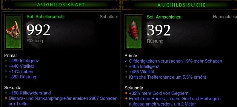 @ Govinda : Danke !!! Dieses Aughilds Macht ist so geil, ich musste leider auf mein anderes SET Bonus verzichten ( wo man 100 AR und 20 % Leben bekommt ) aber man darf eins nicht vergessen , ich besitze nun 7 % Schutz für Nahkampf und Fernkampf + 15 % Schutz vs Elite , das macht gegen Elite also 22 % mehr Schutz und das wird in der Zähigkeit nicht mit einberechnet !