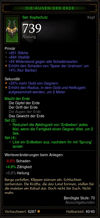@Balius Erden Helm ist sehr selten ich hatte bisher 3 oder 4 und habe den Barb ja wirklich bis zur Vergasung gespielt auch in den letzten Tagen wieder.