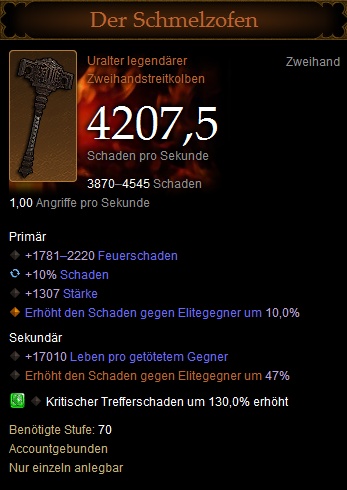Der fiel so vor 3-4 Tagen und war der zweite uralte Schmelzofen in der Season, wobei ich zu 99% Barb gespielt habe und ca. 620 Paralevel dafür nötig waren. Der erste kam aber relativ schnell und war auch nicht schlecht.