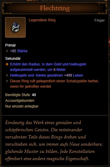 aklaa schrieb:Hat jemand noch den alten Goblin Ring lvl60 der nicht gebraucht wird? Hab nur den 40ger gefunden und wollte für Templer geben. Die alten sind nicht accoundbond. Mal testen ob das Goblinlevel kommt