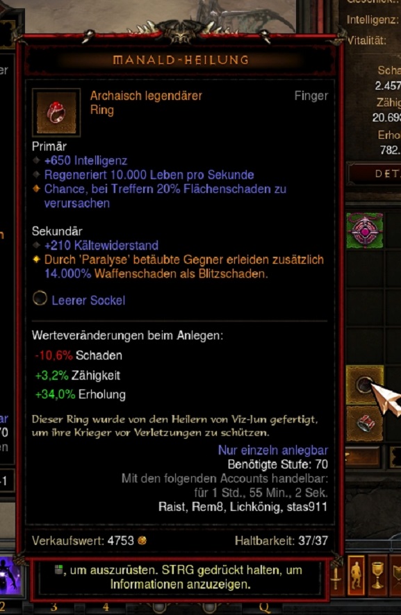 Manald was sonst. Ich spiele den build seit anfang an also 3 seasons durch plus ns als bosskiller. Sollten so um die 1000 stunden sein mittlerweile. Mein bester manald ist immer noch nonancient mit 8 cd und 6/46 crit dafuer aber nur 13600 oder sowas damage. Da der mage in grifts eh nur noch als support rennt habe ich es aufgegeben dort noch mehr mats reinzustecken. Ich kenn dein paralevel bzw deine spielstunden nicht aber ich kann dir nur den rat geben lass es. Lieber die mats in nen ancient guertel investieren mit zwingend 50 stacks oder alternativ bei hohen paragon in nen perfekten swami oder halt amu. Gerade der manald hat so grausige random stats da er wie die windrose selten mit sockel dropt. Dann brauchst du noch cooldown perfekte 8 %... nachher hast du die ganze zeit vergeudet und es kommt kein besserer. Erspar dir den frust . Rein interessehalber: hast du schon alles augmentet und bei welcher griftstufe haengst du? Eventuell bringen dir gameplaytips mehr als ein ringupgrade... jeder hier kann ein lied singen von wizards die t13 nicht voran kommen weil sie stumpf hydras casten...