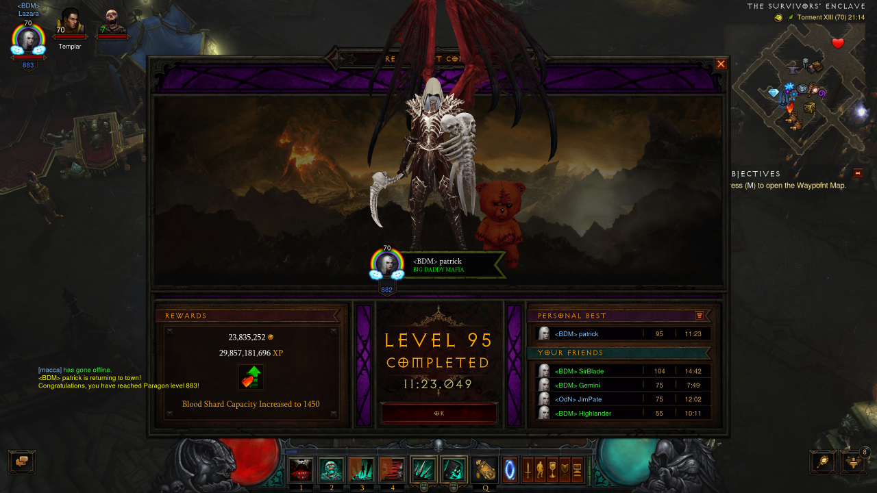 Hatte in der Season mit Para920 einen GR100 gemacht in 14:18min (Pet-Build... kein CorpseLancer). Auch nur Solo und Selffound gespielt. Jetzt in der OffSeason mit ~1850Para und dem Buff des Set-Bonus' auf 4000% habe ich gestern GR103 in 9:17min gemacht.