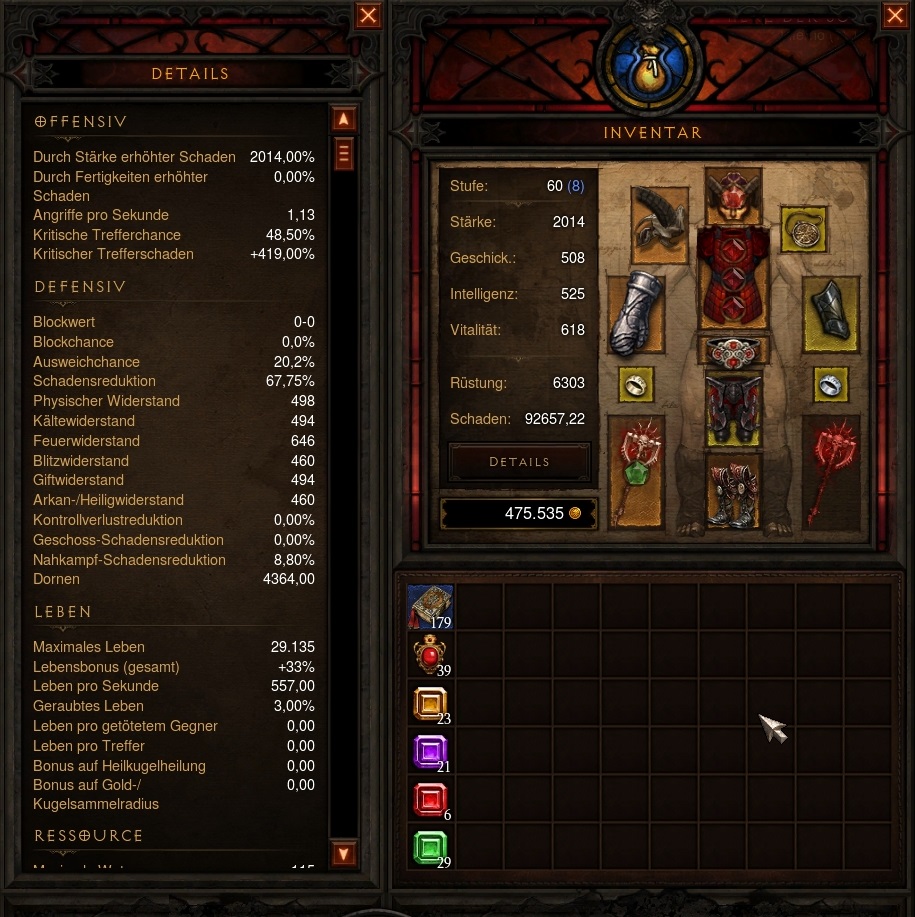 Das AH hat mir wieder ein Schnäppchen verwehrt indem es mein Gebot nicht angenommen hat obwohl er weit drunter stand... Naja habe mir jetzt für 700k einen mit 180 Strength, 7% Life und 80 All Resi gekauft.