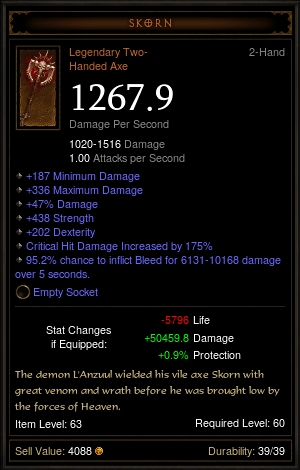 so das ist das gute Stück für die erste ganz passabel, zwar kein LL und statt dex wäre Vita nice gewesen, trotzdem macht die 18k dps mehr, wie meine Skorn die ich mir mal für 8m gekauft habe, also bleibt die erstmal im Koffer