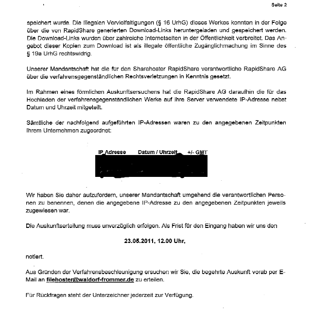 Ich habe bei der Hetzner Online AG einen EQ6 Server, für Testzwecke, VPN, Virtualisierung, etz., nun habe ich mir den Server mit ein Paar anderen geteilt, allerdings hat wohl einer von denen Scheiß gemacht und einen illegalen Film der Constantin Film Verleih GmbH bei Rapidshare hoch geladen. Den fraglichen Benutzer konnte ich ziemlich sicher identifizieren, da er der ein zigste war, der zur fraglichen Uhrzeit eingeloggt war und im Eventlog geloggt wurde (Inklusive seiner IP[Telekom]). Nun ist meine Frage: