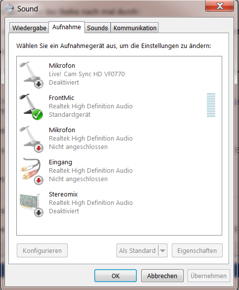 Vergleiche den Zustand der Reiter Aufnahme und Wiedergabe, wenn nur das Mic angesteckt ist, mit dem Zustand beider Reiter, wenn Mic und Kopfhörer angesteckt sind. Was genau verändert sich? Gerne auch Screenshots!
