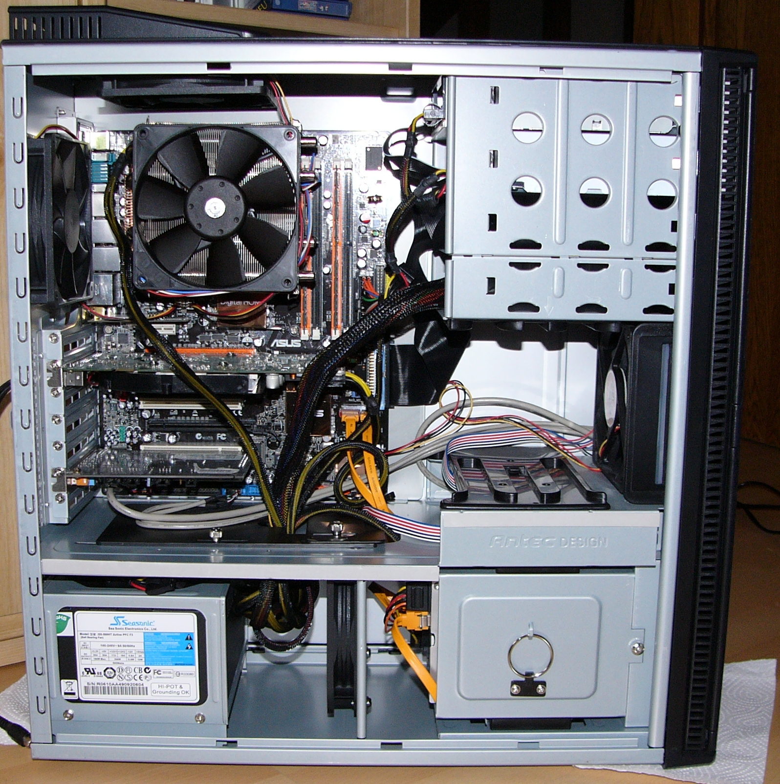 Hier ein Bild meiner ersten Config des P180. Damals (2007) noch mit einem C2D E6600. 2013 dann auf einen Core i5 gewechselt. Im Dez. 2019 bin ich dann auf Ryzen gewechselt und hab das Gehäuse gegen ein Fractal R5 eingetauscht, weil ich das Kabelmanagement des Antec bescheiden fand.