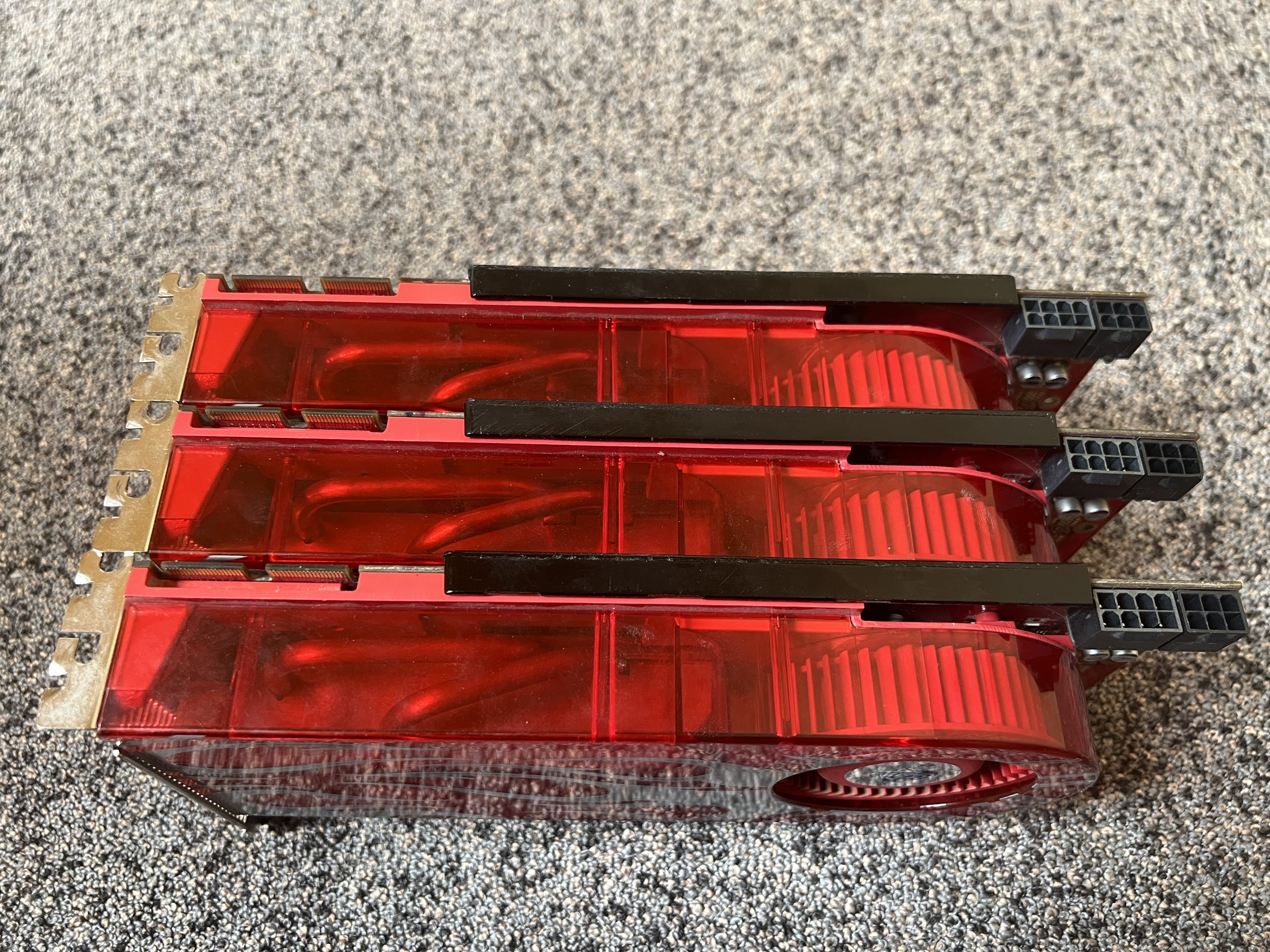 Bei CF, als auch SLI war die obere Karte jedoch quasi abgeschnitten von der Luftzufuhr da zwischen den Karten quasi kein Abstand möglich war ( Board Layout bedingt ) um Frischluft anzusaugen, was dann richtig katastrophale lüftergeschwindigkeiten bei den oberen Karten verursachten