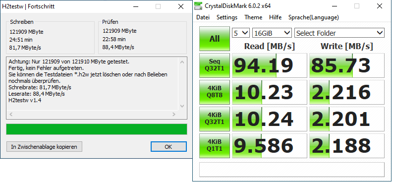 Aber ich hab gerade mal meine H2testw Bilder rausgesucht (jede neue SD/Stick/HDD/SSD muss da durch und das entsprechende Bild speichere ich ab). Die am Schluss angzeigte Geschwindigkeit scheint die Durchschnittsgeschwindigkeit zu sein (wenn man über die Zeit zurückrechnet.