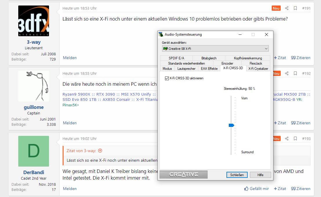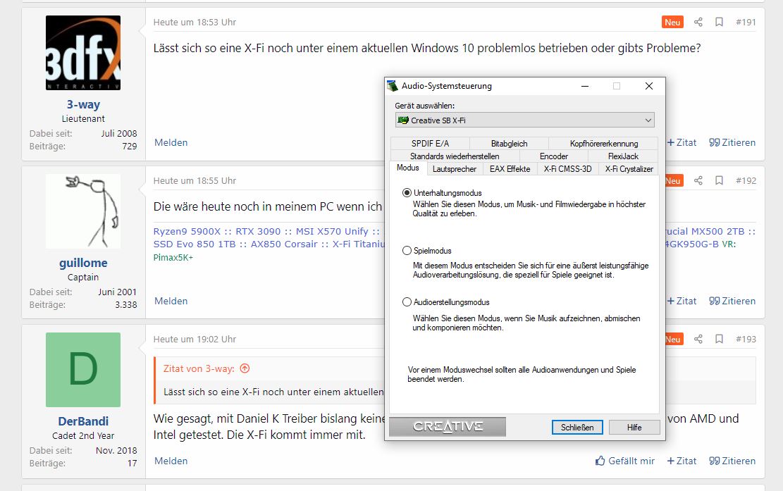 Ich hatte sie alle. Erst Soundblaster, dann Gravis Ultrasound, danach die legendäre Terratec EWS64 und dann die XFi Fatality. Mittlerweile liegt alles in der Schublade. Mir reicht mein Onboard ALC1220 Sound, der an meinen beiden Nuberts + Canton Sub wirklich gut ist.