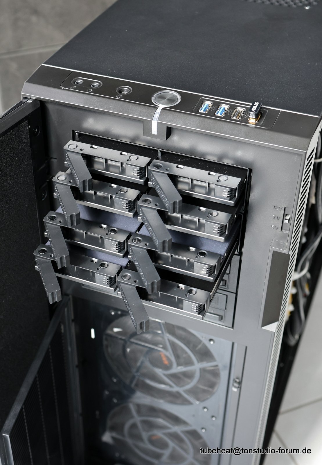 Airflow Verbesserungen - zwecks besserem Airflow habe ich die beiden inneren Laufwerkskäfige entfernt und alle 8 SSDs in zwei Icy Dock MB324SP-B Wechselrahmen gepackt, die jeweils 4 SSDs aufnehmen können und vorn in zwei von den vier 5 1⁄4" Laufwerksschächten in der Front eingebaut.